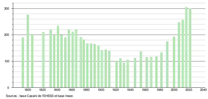 L'évolution du nombre d'habitants est connue à travers les recensements de la population effectués dans la commune depuis 1793. Pour les communes de moins de 10 000 habitants, une enquête de recensement portant sur toute la population est réalisée tous les cinq ans, les populations légales des années intermédiaires étant quant à elles estimées par interpolation ou extrapolation[29]. Pour la commune, le premier recensement exhaustif entrant dans le cadre du nouveau dispositif a été réalisé en 2006[30].