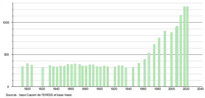 L'évolution du nombre d'habitants est connue à travers les recensements de la population effectués dans la commune depuis 1793. Pour les communes de moins de 10 000 habitants, une enquête de recensement portant sur toute la population est réalisée tous les cinq ans, les populations légales des années intermédiaires étant quant à elles estimées par interpolation ou extrapolation[46]. Pour la commune, le premier recensement exhaustif entrant dans le cadre du nouveau dispositif a été réalisé en 2007[47].