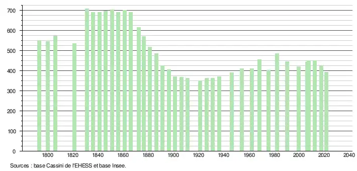 L'évolution du nombre d'habitants est connue à travers les recensements de la population effectués dans la commune depuis 1793. Pour les communes de moins de 10 000 habitants, une enquête de recensement portant sur toute la population est réalisée tous les cinq ans, les populations légales des années intermédiaires étant quant à elles estimées par interpolation ou extrapolation[24]. Pour la commune, le premier recensement exhaustif entrant dans le cadre du nouveau dispositif a été réalisé en 2007[25].