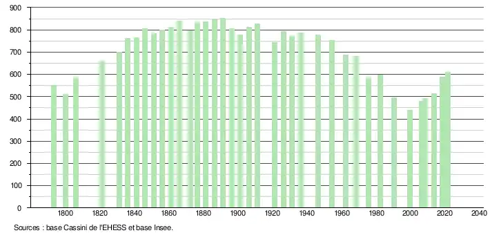 L'évolution du nombre d'habitants est connue à travers les recensements de la population effectués dans la commune depuis 1793. Pour les communes de moins de 10 000 habitants, une enquête de recensement portant sur toute la population est réalisée tous les cinq ans, les populations légales des années intermédiaires étant quant à elles estimées par interpolation ou extrapolation[31]. Pour la commune, le premier recensement exhaustif entrant dans le cadre du nouveau dispositif a été réalisé en 2008[32].