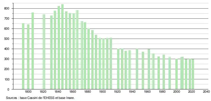 L'évolution du nombre d'habitants est connue à travers les recensements de la population effectués dans la commune depuis 1793. Pour les communes de moins de 10 000 habitants, une enquête de recensement portant sur toute la population est réalisée tous les cinq ans, les populations légales des années intermédiaires étant quant à elles estimées par interpolation ou extrapolation[22]. Pour la commune, le premier recensement exhaustif entrant dans le cadre du nouveau dispositif a été réalisé en 2007[23].