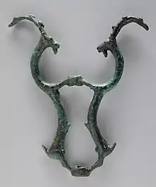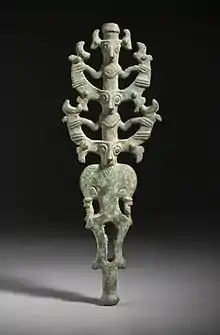 Parmi les bronzes les plus caractéristiques se trouve une gamme d’objets avec une douille creuse ou un anneau, conçus pour être fixés au sommet d’une perche ou de tout autre support vertical, souvent à l’aide d’un accessoire intermédiaire indépendant. Ils peuvent avoir été utilisés avec d'autres éléments disparus[6]. Si leur fonction reste sujet à controverse, il s'agit sans doute d'emblèmes personnels de guerriers [7]. Comparées à des motifs plus récents, les sculptures animales se distinguent par leur naturalisme, en particulier le groupe des bouquetins[8]. Il existe également des tubes antropomorphes, dont certaines forment une tête de Janus[9]