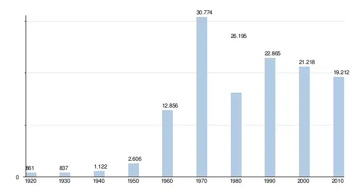 Sa population était estimée à 19 212 habitants lors du recensement de 2010, ce qui donne une densité de 985,2 hab/km2.