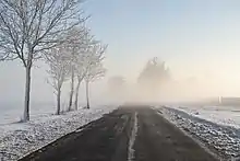 Lorsque la température de l'air, du sol et des objets baignés par la nappe de brouillard est inférieure à 0 °C le brouillard peut être givrant. Les gouttelettes en suspension sont alors en surfusion (à l'état liquide par température négative) et gèlent au contact, formant du givre (ou de la glace noire sur une chaussée)[2]. Ceci peut entraîner des dépôts importants sur les chaussées, la végétation et toutes les structures[3].