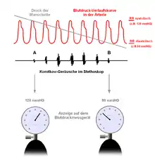 Si la pression du brassard diminue jusqu'à égaler la pression systolique, on peut entendre le premier bruit de Korotkoff. Le sang passe de manière turbulente et un son est audible.