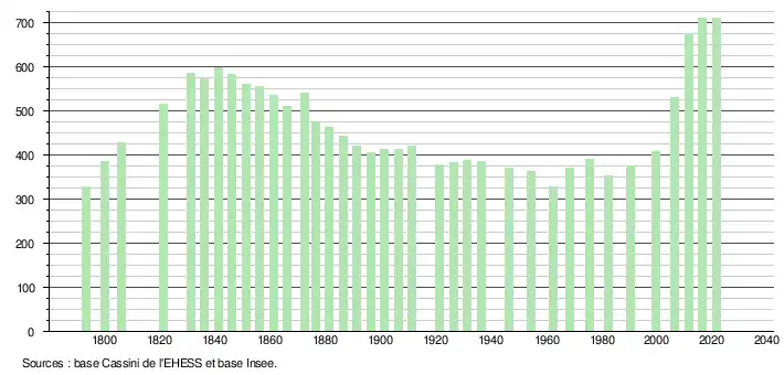 L'évolution du nombre d'habitants est connue à travers les recensements de la population effectués dans la commune depuis 1793. Pour les communes de moins de 10 000 habitants, une enquête de recensement portant sur toute la population est réalisée tous les cinq ans, les populations légales des années intermédiaires étant quant à elles estimées par interpolation ou extrapolation[29]. Pour la commune, le premier recensement exhaustif entrant dans le cadre du nouveau dispositif a été réalisé en 2006[30].