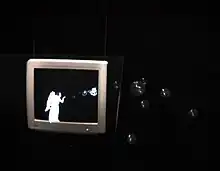 - Mais,...l'ange (1999) : Cette œuvre présentée dans le cadre des manifestations numériques à Montbéliard[5] met en scène l'image d'un ange, grâce au dispositif de théâtre optique, soufflant des bulles virtuelles. Lorsque ces bulles s'échappent du cadre de la projection, elles deviennent réelles et offrent le loisir au visiteur de jouer avec elles... "mais,...l'ange" invite à une réflexion sur la perméabilité des niveaux de représentation entre le réel et le virtuel.