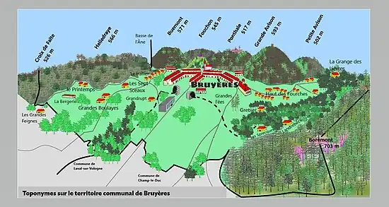 L'analyse des autres toponymes de la commune de Bruyères tels qu'ils apparaissaient encore à la fin du XIXe siècle apporte un deuxième éclairage intéressant. L'habitat dispersé y est très représenté et la dominante agro-sylvo-pastorale dans le mode de vie des habitants a davantage favorisé une toponymie du lieu-dit et de la ferme à l'écart[25] très pratiquée dans les parties plus élevées en altitude du massif[26]. La toponymie a en réalité conservé les traces d'une ancienne forme d'habitat qui ne correspond plus au visuel d'aujourd'hui. D'ailleurs, une grande partie des fermes isolées sont aujourd'hui en ruines enfouies dans les bois qui ont reconquis les terres autrefois défrichées. Par sa toponymie, Bruyères est clairement rattaché à la montagne avec laquelle elle partage quelques toponymes récurrents. Jusqu'au milieu du XXe siècle, jeunes et moins jeunes pratiquaient encore la tradition de nommer une famille non pas par leur nom patronymique, mais bien par le lieu-dit de leur ferme à défaut d'utiliser un sobriquet également très fréquent.