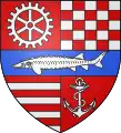 Blason | De gueules à la fasce ondée d'argent accompagnée en chef d'une forteresse crénelée sommée d'une tourelle crénelée et couverte d'or, maçonnée de sable, ouverte d'azur, et en pointe d'un château crénelé sommé de trois tourelles crénelées et couvertes d'or, ouvert de deux portes d'azur |