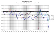 Avec un PIB nominal de 474 924 milliards de yens (5 075 milliards de dollars) en 2009 en baisse de 5 % par rapport à 2008 à la suite de la crise économique de 2008-2010[22] ; Le gouvernement Yukio Hatoyama annonce, en décembre 2009, un plan de relance de 24 400 milliards de yens, soit 184 milliards d'euros dont 7 200 milliards de yens (54,5 milliards d'euros) de dépenses directes portant le déficit pour l'année fiscale en cours à dette émise au cours du présent exercice au montant record de 53 500 milliards de yens. Les dépenses pour l'année fiscale 2009 serait au total de 105 billions de yens.