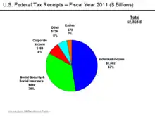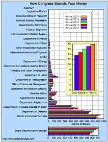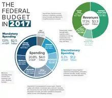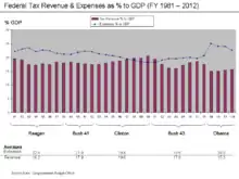 Pour l'année fiscale 2012, le budget voté comprend 3 796 milliards de dollars américains de dépenses, des recettes de 2 469 milliards de dollars et un déficit de 1 327 milliards de dollars. Les dépenses publiques sont à 24 % du PIB, les recettes fédérales à 17 % (24 % pour l'ensemble des prélèvements obligatoires en comptant les taxes locales), soit dans les deux cas des niveaux historiquement haut et bas respectivement et parmi les pourcentages les plus bas de l'organisation de coopération et de développement économiques[9]. Les dépenses discrétionnaires sont de 967 milliards de dollars pour l’année fiscale 2013, elles devraient être de 1 014 milliards de 2014 et de 1 016 milliards en 2015.