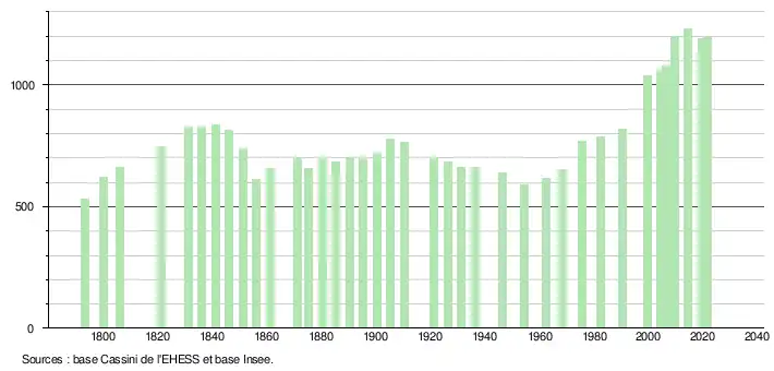 L'évolution du nombre d'habitants est connue à travers les recensements de la population effectués dans la commune depuis 1793. Pour les communes de moins de 10 000 habitants, une enquête de recensement portant sur toute la population est réalisée tous les cinq ans, les populations légales des années intermédiaires étant quant à elles estimées par interpolation ou extrapolation[21]. Pour la commune, le premier recensement exhaustif entrant dans le cadre du nouveau dispositif a été réalisé en 2004[22].