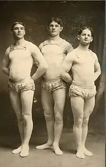 Les spectacles de jambes, tels que la comédie musicale The Black Crook (1866), deviennent populaires à la même époque[18]. L'influence du spectacle de ménestrel ne tarde pas à suivre. L'une des premières troupes burlesques américaines est la Rentz-Santley Novelty and Burlesque Company, créée en 1870 par Michael B. Leavitt, qui avait auparavant féminisé le spectacle de ménestrels avec sa troupe Madame Rentz's Female Minstrels (en)[19]. Le burlesque américain adopte rapidement la structure tripartite du spectacle des ménestrels : la première partie est composée de chansons et de danses interprétées par une compagnie féminine, entrecoupées de mauvaises comédies interprétées par des comédiens masculins. La deuxième partie présente diverses spécialités courtes et des olios (en), des numéros de vaudeville, dans lesquels les femmes n'apparaissent pas. Le spectacle se termine par une grande finale. Parfois, le spectacle est suivi d'un match de boxe ou de lutte[14].