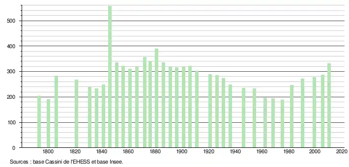 L'évolution du nombre d'habitants est connue à travers les recensements de la population effectués dans la commune depuis 1793. À partir du , les populations légales des communes sont publiées annuellement dans le cadre d'un recensement qui repose désormais sur une collecte d'information annuelle, concernant successivement tous les territoires communaux au cours d'une période de cinq ans. Pour les communes de moins de 10 000 habitants, une enquête de recensement portant sur toute la population est réalisée tous les cinq ans, les populations légales des années intermédiaires étant quant à elles estimées par interpolation ou extrapolation[4]. Pour la commune, le premier recensement exhaustif entrant dans le cadre du nouveau dispositif a été réalisé en 2005[5],[Note 1].