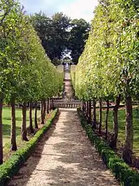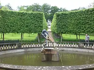 Devant la façade nord de la maison se trouve un parterre de pelouse formel avec une fontaine en bronze représentant Mercure. Menant du voisinage immédiat de la maison, une série d'avenues boisées mènent à de plus petits jardins en forme de cocardes, ces jardins comprennent un jardin d'agrumes, une roseraie et un jardin oscillant[21]. D'autres vues sur les bois mènent à diverses statues de jardin accrocheuses, notamment une urne monumentale contenant les restes du 2e Lord Faringdon.