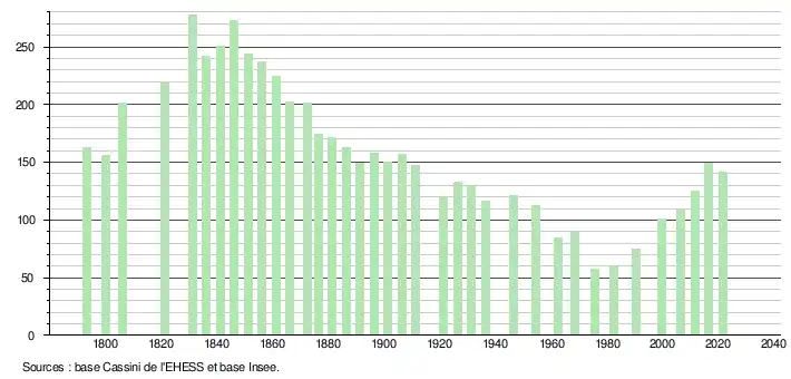 L'évolution du nombre d'habitants est connue à travers les recensements de la population effectués dans la commune depuis 1793. Pour les communes de moins de 10 000 habitants, une enquête de recensement portant sur toute la population est réalisée tous les cinq ans, les populations légales des années intermédiaires étant quant à elles estimées par interpolation ou extrapolation[20]. Pour la commune, le premier recensement exhaustif entrant dans le cadre du nouveau dispositif a été réalisé en 2006[21].