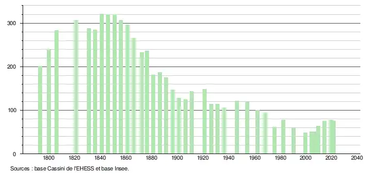 L'évolution du nombre d'habitants est connue à travers les recensements de la population effectués dans la commune depuis 1793. Pour les communes de moins de 10 000 habitants, une enquête de recensement portant sur toute la population est réalisée tous les cinq ans, les populations légales des années intermédiaires étant quant à elles estimées par interpolation ou extrapolation[14]. Pour la commune, le premier recensement exhaustif entrant dans le cadre du nouveau dispositif a été réalisé en 2004[15].