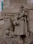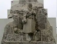 Le monument a la forme d'une tour de pierres ajourée à son sommet sur les quatre côtés. Chaque ouverture est barrée d'une épée sculptée pointe en bas, en signe de paix. Le groupe sculpté représente deux soldats français en tenue de 1915, l'un veillant, appuyé sur son fusil, avec à la main une grenade, l'autre endormi, dans la tranchée. Au-dessus d'eux, les restes du marronnier, mutilé par les obus[réf. souhaitée]. L'architecte du monument est le Parisien Édouard Monestès, la sculpture au pied de la tour est l'œuvre du sculpteur sétois, Marius Roussel, qui combattit à Vauquois dans 31e régiment d'infanterie[4].