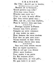 Elle a été écrite en 1815 dans le contexte de l'occupation de la France, qui suis la chute de Napoléon Bonaparte. Elle est initialement composée de trois couplets[1],[2],[3],[4]. Elle se chante sur l'air de Aussitôt que la lumière[1],[5].