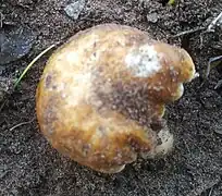 Son chapeau est convexe, brun blanchâtre à brun clair chez les échantillons jeunes et frais. Elle s'assombrit aux bords après la récolte, et devient avec l'âge brun sombre avec des taches décolorées. La surface du chapeau est plus au moins irrégulière.