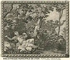 Mort de Procris tuée d'une flèche dans la poitrine (Sébastien Leclerc, pour Les Métamorphoses d'Ovide en rondeaux, 1676)