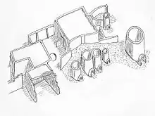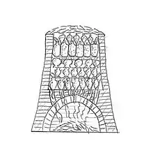 Le progrès technologique suivant est l'introduction d'une plaque perforée qui sépare le foyer de la chambre de cuisson. Ceci empêche les flammes, la fumée et les cendres volantes d'entrer en contact avec la céramique et de causer des taches ou des traces de fumée[31]. Les récipients à cuire sont entassés dans la partie supérieure, l'ouverture est en bas. Les gaz chauds montent sur les récipients et circulent parmi eux, ce qui cuit l'argile[32]. Ce genre de four à cheminée et plaque perforée sont attestés depuis l'Ancien Empire par des représentations figurées et des trouvailles archéologiques.