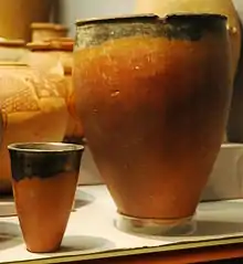 Comme les potiers ne connaissent, au cinquième millénaire avant notre ère, que des méthodes de cuisson rudimentaires dans une fosse, ces récipients comportent souvent un bord supérieur noir. Progressivement, ces bords noirs deviennent un élément décoratif qui demande quelques connaissances techniques. En combinaison avec une couleur rouge sombre et un émail, cette céramique black-topped devient une poterie la plus élaborée et la plus populaire. La couleur noire est obtenue par carbonisation, par exemple par infiltration de particules de fumée dans la masse d'argile. Certaines questions sur cette technique de fabrication ne sont cependant pas résolues[36],[37].