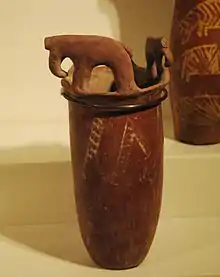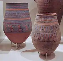 - style decorated[n 2] : typique des cultures de Nagada II et III (-3500/-3000). Céramique composée surtout d'argile calcaire A1. La surface est bien lissée, mais pas polie. La couleur varie du rouge clair au gris jaunâtre. Des décors peints ont été faits en couleur brun-rouge. Les motifs principaux sont des bateaux, du gibier du désert, des flamants, des personnages, des spirales, des lignes ondulées et en zigzags ;
