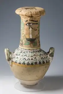 Les potiers jouent depuis l'époque prédynastique avec les formes qu'ils donnent, en façonnant les poteries de manière créative, ou en imitant d'autres matériaux, tels que vannerie, métal, bois ou pierre. La plupart des formes insolites (fancy features[33]) sont introduites pendant le montage ou le travail de la surface, bien avant la cuisson. Les éléments sont formés à la main à partir d'un morceau d'argile, ou moulés, puis collés par pression sur le récipient à l'état de cuir durci, ce dont témoignent souvent des empreintes de doigts à l'intérieur du récipient. Dans le cas de récipients figurés, ce sont souvent des parties du corps humain ou animal, ou le visage du dieu Bès ou de la déesse Hathor. Il est fréquent aussi que des parties du récipient à l'état de cuir durci soient découpées pour imiter des matériaux non céramiques[34].