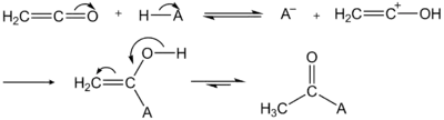 La réaction du cétène avec le crotonaldéhyde produit le bêta-lactone ou du polyester. Ces derniers sont ensuite convertis par voie thermique ou par voie catalytique en acide sorbique[3].