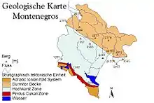 La côte monténégrine est principalement formée par les unités tectoniques de la zone de plissement adriatique-ionienne et de la zone Pinde-Cukali. Ce n'est qu'à l'intérieur de la baie de Kotor que la couverture karstique de l'orogène dinarique atteint directement la mer.