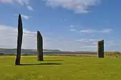 | 514bis-002 | Pierres de Stenness | Les quatre mégalithes restant d'un henge, le plus grand mesurant 6 m de hauteur[6],[7] | 0,8 | 58° 59′ 29″ nord, 3° 12′ 28″ ouest | ![]() | |