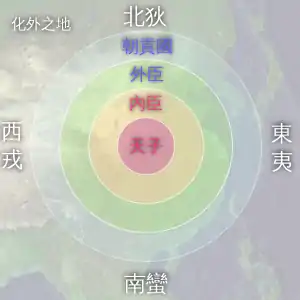 Selon Marcel Granet, ce mot est chargé de la connotation suivante : le ciel étant rond et la terre carrée dans la cosmogonie chinoise, les quatre coins de la terre qui ne sont pas couverts par le ciel (ni donc circonscrits par les cycles du soleil et les pérégrinations de l’empereur) sont conçus comme des territoires incultes peuplés d’êtres non civilisés. 天下 désigne donc la partie civilisée de la terre (voir schéma ci-dessous).