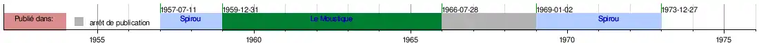 La série, d'abord publiée dans le journal Spirou entre 1957 et 1959, est ensuite transférée dans le journal Le Moustique entre 1959 et 1966, avant que les gags parus dans Le Moustique soient publiés à nouveau dans Spirou et son édition néerlandophone Robbedoes de 1969 à 1973. La série est en parallèle publiée dans quatre albums brochés, puis rééditée en intégrale dans les années 1980 et 90, ainsi qu'en novembre 2011.