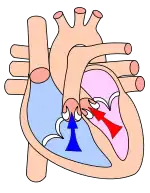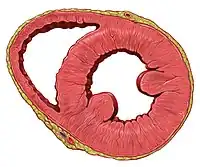 Le cœur est un muscle creux contenant deux parties séparées bien qu'accolées l'une à l'autre : le « cœur gauche » et le « cœur droit ». Ces deux « cœurs » sont situés côte-à-côte dans l'axe base-apex, séparés par une paroi globalement verticale et orientée dans l'axe du cœur. Chacune de ces deux parties est subdivisée en deux chambres ou cavités, l'atrium (ou oreillette) vers la base et le ventricule vers l'apex. Ces deux cavités sont séparées par une valve ; on distingue ainsi la valve mitrale, entre l'atrium et le ventricule gauches, et la valve tricuspide, entre l'atrium et le ventricule droits. L'organisation est symétrique entre le cœur gauche et le cœur droit, bien que le cœur gauche soit plus volumineux.