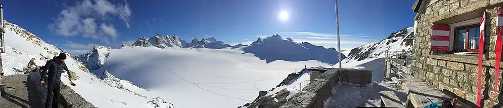 Vue panoramique vers le sud-ouest depuis la cabane du Trient sur le glacier du même nom et différents sommets dont les aiguilles Dorées, la Grande Fourche et les aiguilles du Tour.