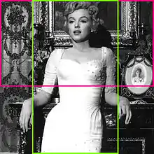 - Quand il y a un sujet principal, la plupart des manuels recommandent de ne pas le centrer, mais de placer le point d'intérêt à un des quatre points situés au tiers de l'image, tant horizontalement que verticalement[39]. Certains auteurs préconisent de diviser le cadre non pas en trois parties égales, mais selon la proportion d'or. Les objets à placer aux points forts ayant une certaine étendue, il toucheront certainement à un point fort obtenu par la règle des tiers, situé à 1/20 de la dimension de l'image plus près du bord.