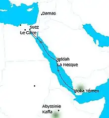 En 1685, Philippe Sylvestre Dufour[19], un marchand d'épices français, écrivait « De tous les endroits du monde, je ne pense pas qu'il y en ait d'autre qui produise le Café que l'Yémen... Il croît dans des vastes Campagnes tirant vers le Midi, sans culture, et point du tout ailleurs. Étant cueilli, on l'apporte à Moka, à Louyaya, et autres ports de mer, qui sont le long de la Mer Rouge, où on le charge sur de petites barques pour Gedda (Djeddah)...là on l'embarque, sur des Vaisseaux et sur des Galères, qui sont ordinairement destinées pour ce transport, jusqu'à Sués (Suez), port de mer à la tête de la Mer Rouge, éloigné du Caire d'environ vingt & deux lieues, où l'on en transporte toutes les années sur des chameaux. Outre cela, il en vient... par la Caravane qui retourne de Médine avec les Pèlerins du Prophète, qui en chargent aussi quatre ou cinq mille [balles] sur des Chameaux pour porter à Damas et à Alep ».