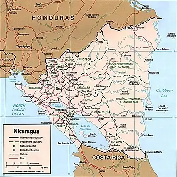 Au Nicaragua, la production caféière s'étend dans la partie nord des hauts plateaux centraux au nord et à l'est d'Estelí, ainsi que dans la région volcanique autour de Jinotepe. Dans les années 1980, après la révolution sandiniste de 1979, la rébellion des Contras attaque les convois caféiers et camions, à partir de 1982[3]. Bien que la production de café ait légèrement diminué à la fin des années 1980, la récolte de 1989 était encore de 42 000 tonnes. En 1992, plus de terres ont été plantées en café que dans n'importe quelle autre culture.
