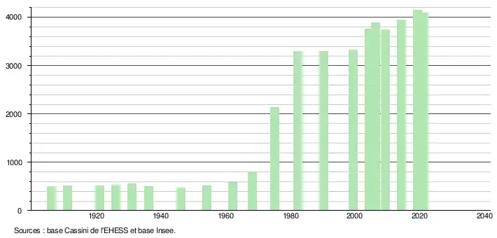 L'évolution du nombre d'habitants est connue à travers les recensements de la population effectués dans la commune depuis 1906. Pour les communes de moins de 10 000 habitants, une enquête de recensement portant sur toute la population est réalisée tous les cinq ans, les populations légales des années intermédiaires étant quant à elles estimées par interpolation ou extrapolation[45]. Pour la commune, le premier recensement exhaustif entrant dans le cadre du nouveau dispositif a été réalisé en 2004[46].