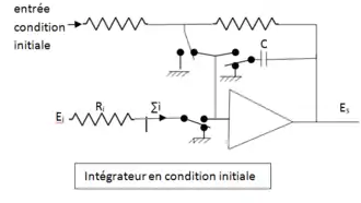 - l'état initial : rien n'évolue on est figé au temps , l'intégrateur fonctionne alors comme un simple inverseur avec une entrée spéciale permettant de définir la valeur initiale de Es à laquelle est chargée le condensateur (voir schéma : « intégrateur en condition initiale ») ;
