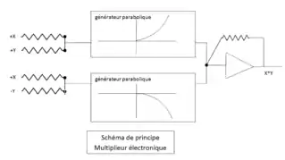 Par la suite,il a été remplacé par un système entièrement électronique qui réalise le produit par l'équation : . Il nécessite deux générateurs de courant « paraboliques », un inverseur pour fournir -X et un amplificateur opérationnel pour fournir la tension de sortie résultat. Les générateurs paraboliques sont constitués d'un réseau de résistances et de diodes, dont les diodes se débloquent successivement en fonction de la tension d'entrée du réseau. Chaque parabole est donc approximée par une suite de segments, au moins une vingtaine de segments sont nécessaires pour obtenir une précision de l'ordre de .
