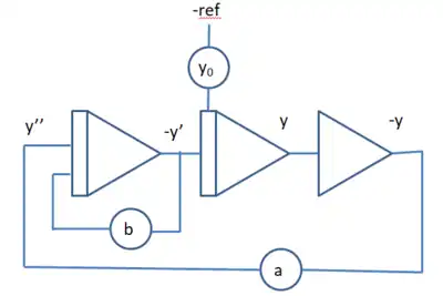 - La tension de référence : Les conditions initiales sont définies à partir de la tension de référence dont la valeur est 1. Par définition. Toutes les mesures sont effectuées par rapport à cette tension de référence. Elle apparaît en de nombreux points sur le panneau de câblage, elle est fournie par une alimentation hautement stabilisée (sa valeur physique était couramment de 100 volts ou de 10 volts).