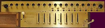 - En 1666, Samuel Morland inventa une machine pour ajouter des quantités monétaires anglaises. Chaque roue était appairée à une petite roue de retenue comme sur la machine de Burattini. Ce n’était pas une machine à calculer. Morland construisit une autre machine avec des disques interchangeables similaires au système des Bâtons de Napier[20],[21].