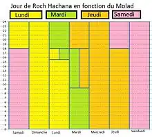 - Une année régulière, avec RH le shabbat. En théorie, c'est possible, mais le tableau des 14 types d'années prouve que cela n'arrive jamais.