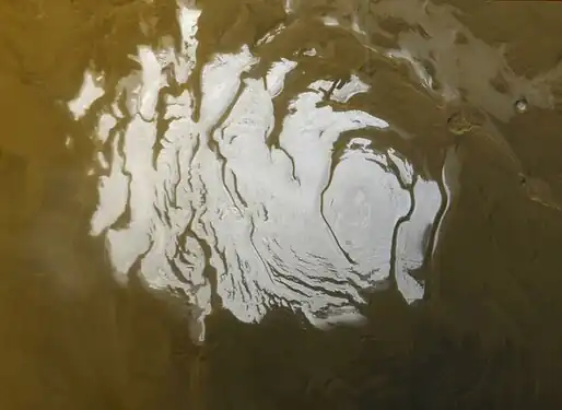 La calotte boréale est bien plus imposante que la calotte australe : elle a une superficie de 1 000 km2. Elle est également plus facile à observer pour les scientifiques car son capuchon de CO2 fond complètement chaque année. Grâce au spectromètre infrarouge MAWD des sondes Viking, qui permet de mesurer la teneur en vapeur d’eau, et à leur radiomètre infrarouge IRTM, qui permet de suivre l’évolution de la température au sol, les scientifiques ont pu déterminer que la composante principale de cette calotte est l’eau.