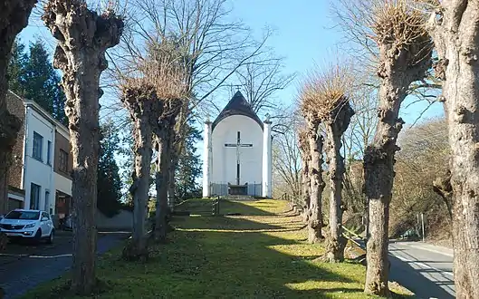 Situé au sommet d'une butte et précédé d'une longue drève de tilleuls têtards, le monument se dresse face au n° 61 de la rue Defalque, qui monte vers le cimetière de Court-Saint-Étienne[3],[4],[2] et s'appelait jadis rue du Calvaire.