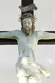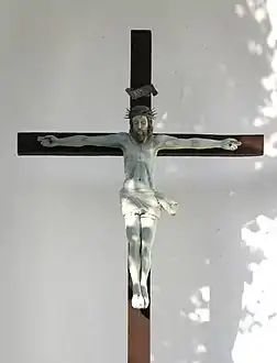 Sous l'auvent, se dresse une grand croix qui portait à l'origine un Christ en bois gothique des XVe et XVIe siècles, qui est maintenant déposé en sûreté à l'intérieur de l'église Saint-Étienne[3],[5]. La croix porte aujourd’hui une copie fidèle de ce Christ[2].