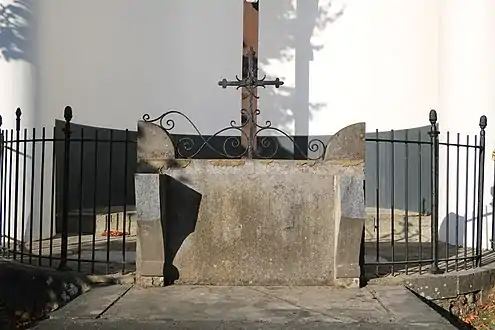 L'auvent abrite également un autel en pierre brisé par le temps dont la face intérieure est gravée de la mention : Priez Dieu Pour l'âme / du Cte P.Eu d'Auxy / Décédé à Court-Saint-Étienne le 12 Août 1855[3].
