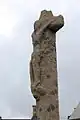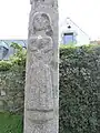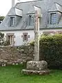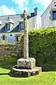 Le calvaire est placé sur un soubassement constitué de deux massifs octogonaux en pierre de taille formant marche. Sur ce soubassement est placé un cube dont les arêtes sont chanfreinées. Une inscription illisible est gravée dans le bloc. La pierre monolithe qui forme le calvaire présente un fût et des arêtes chanfreinées. Une Bretonne vêtue de son costume et de sa coiffe, les deux mains repliées sur la poitrine, est sculptée à la base. Au-dessus, le Christ squelettique, une draperie autour des hanches, est crucifié, les pieds reposant sur une tête de chien[1].